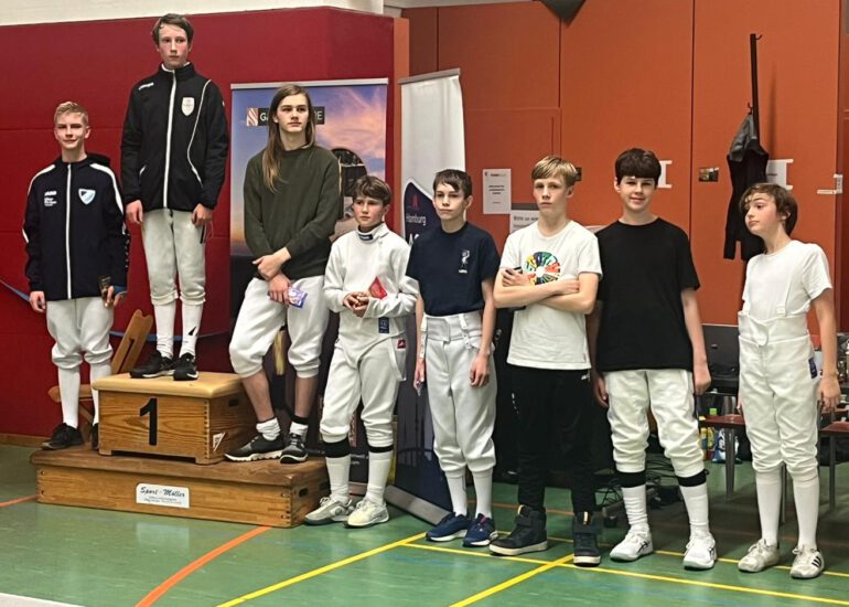 Auch unsere Jüngsten waren wieder zu Gast in Hamburg beim Traubensaft-Säbel-Turnier des ETV am 2.11.25. Für den FC Lütjensee kreuzten die Klingen: Emil Marsian, Laurin Stegmann und Xenia Krogmann bei den U13 open (open = Jungs und Mädchen in einem Turnier) sowie Maxim Krogmann bei den U15 open.